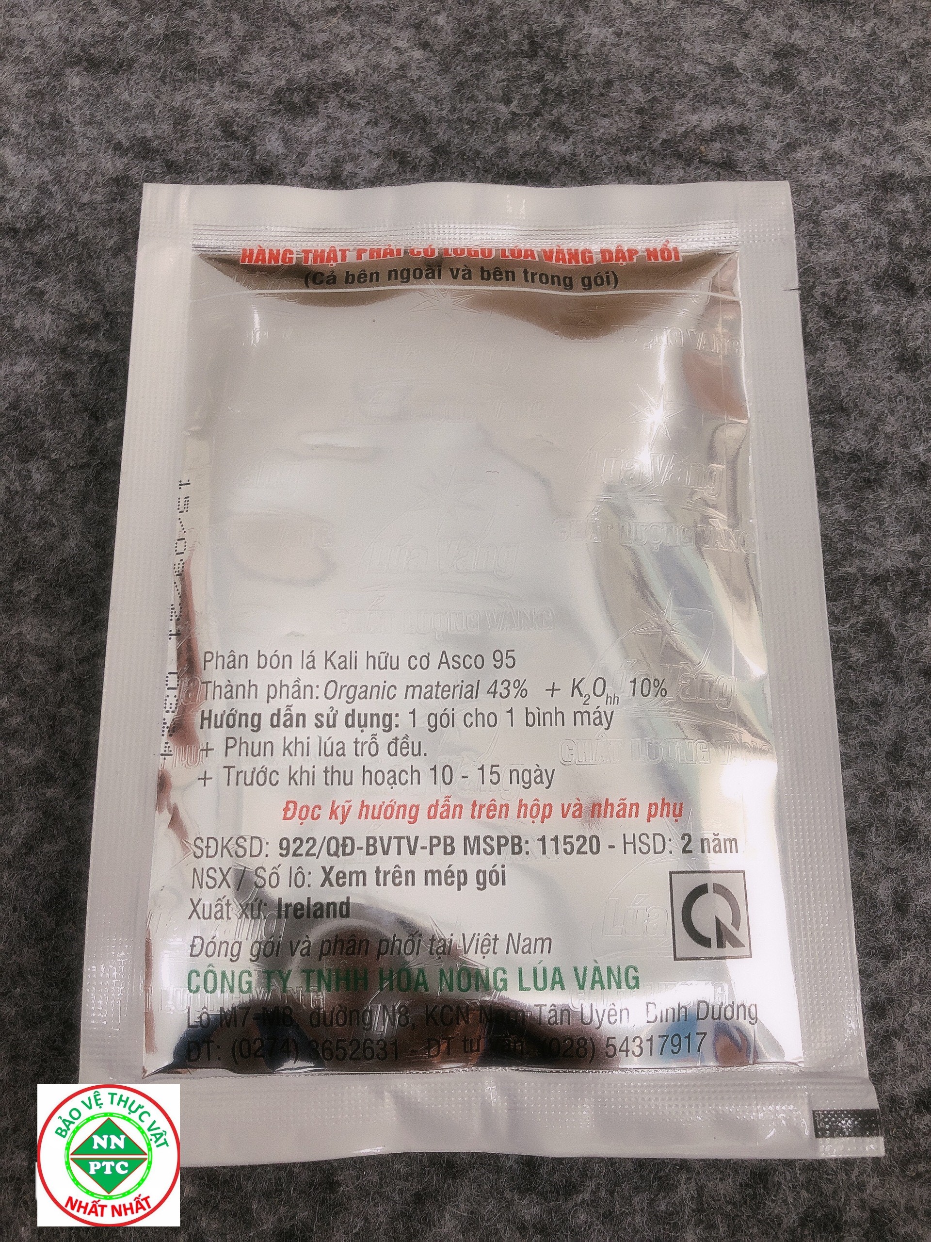 * Thành Phần: Oragnic material 43% + K2Ohh 10% * Công dụng : - Lúa chín nhanh , đồng loạt . - Vô gạo nhanh , hạt no nóc . - Giữ xanh lá đòng , xanh gié lúa . * Hướng dẫn sử dụng: 1 gói cho 1 bình 25 lít. Phun khi lúa trỗ đều .Trước khi thu hoạch 10 - 15 ngày . * Khả năng pha trộn : có thể pha trộn với các loại thuốc trừ sâu , thuốc trừ bệnh thông thường khác , trừ những thuốc quá kiềm hay quá acid . Giá sản phẩm trên Tiki đã bao gồm thuế theo luật hiện hành. Bên cạnh đó, tuỳ vào loại sản phẩm, hình thức và địa chỉ giao hàng mà có thể phát sinh thêm chi phí khác như phí vận chuyển, phụ phí hàng cồng kềnh, thuế nhập khẩu (đối với đơn hàng giao từ nước ngoài có giá trị trên 1 triệu đồng).....
