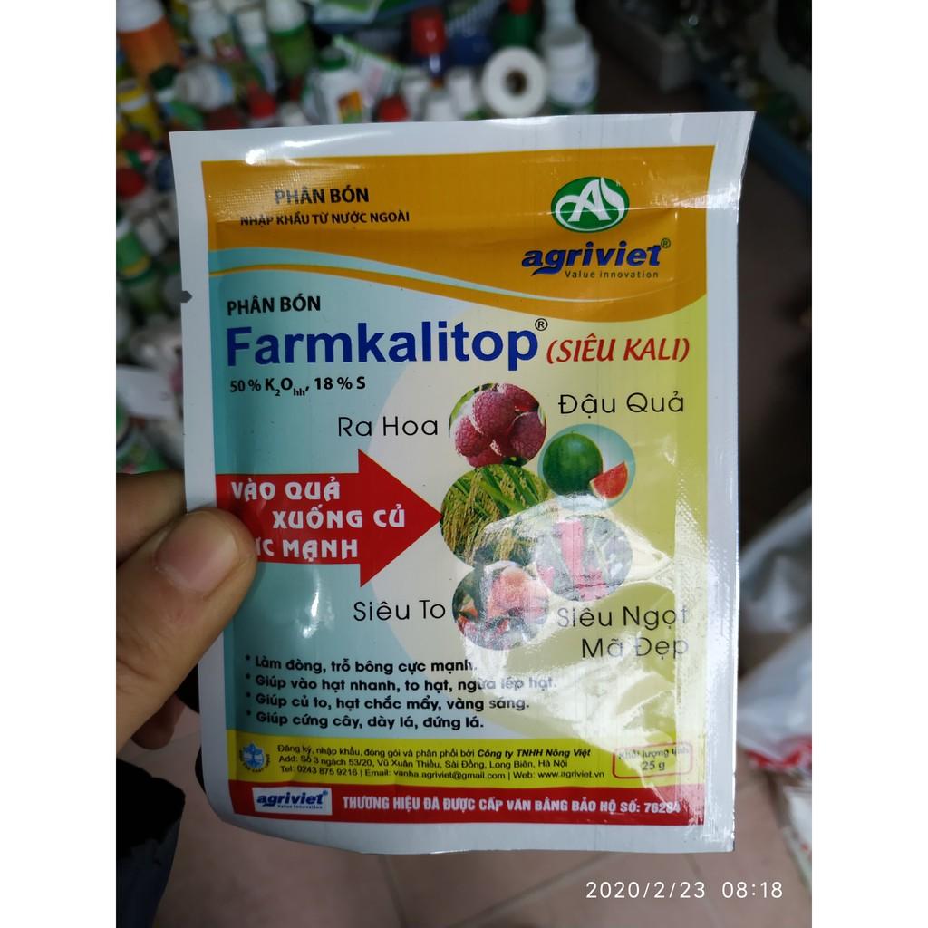 Phân bón nhập khẩu farmKalitop (siêu Kali) Thành phần: 50% K2Ohh, 18% S Khối lượng: 25 gram Công dụng: - Giúp cho Quả-Củ- Hạt: To nặng, ngọt hơn, nhanh chín, mã đẹp, tươi lâu, t...