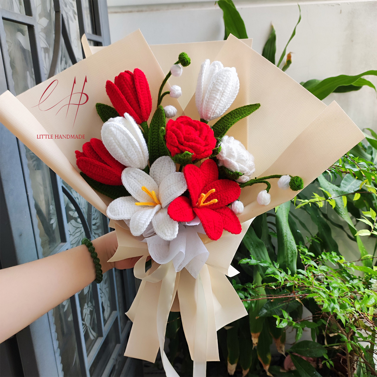 Quà tặng bó hoa tulip và hoa hồng bằng len handmade size vừaKích thước khoảng: dài 45 cm x ngang 32 cmSố lượng:Tulip nở: 2 cànhTulip: 4 cànhHoa hồng: 2 cànhNụ hoa linh lan: 2 cànhTất cả các ảnh đều...