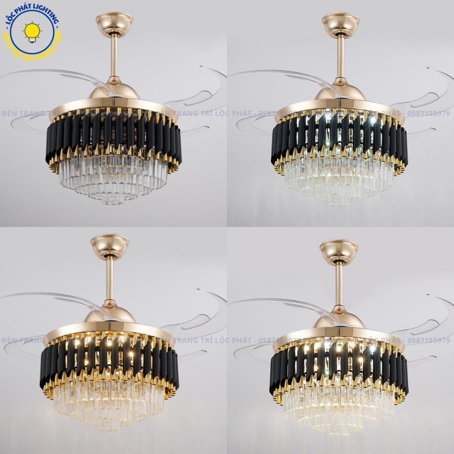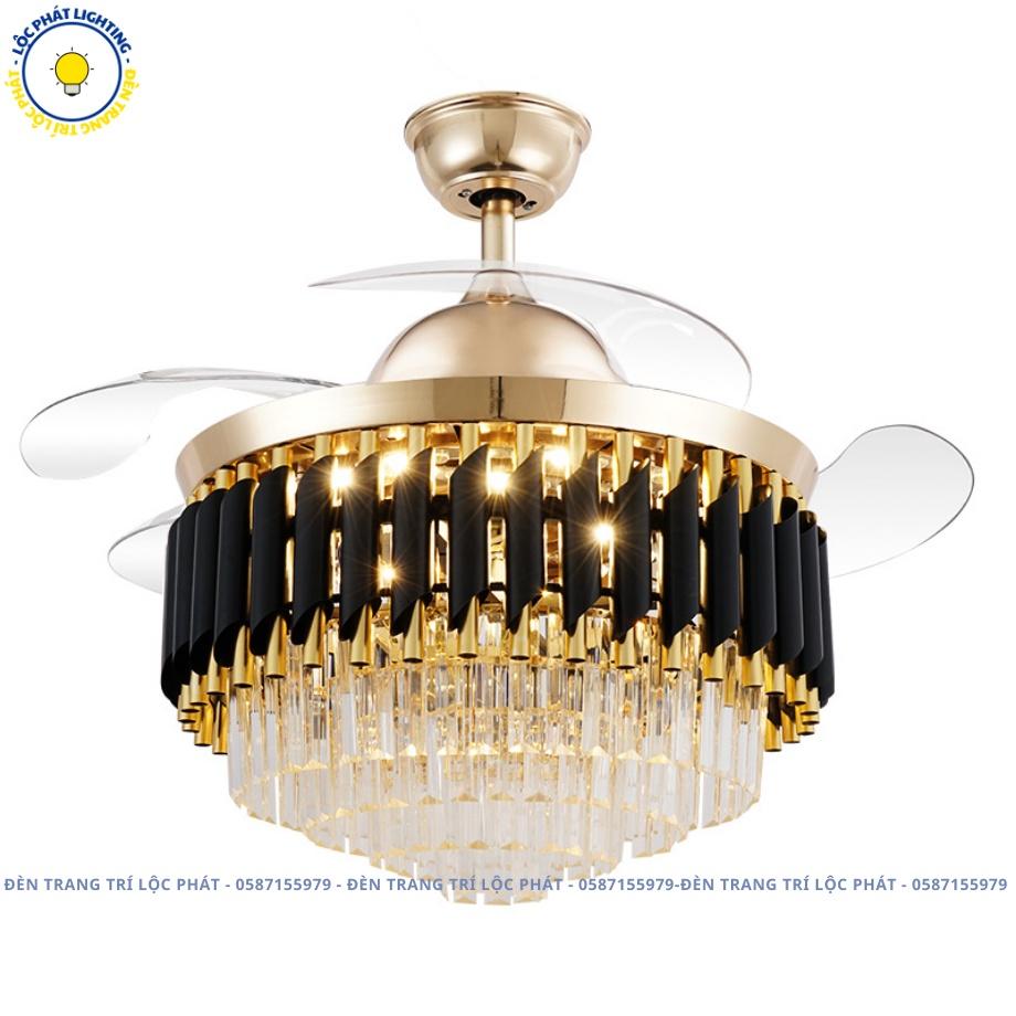 Quạt Trần Đèn Pha Lê Vàng Đen Cánh Cụp Cánh Xòe Trang Trí Phòng Khách