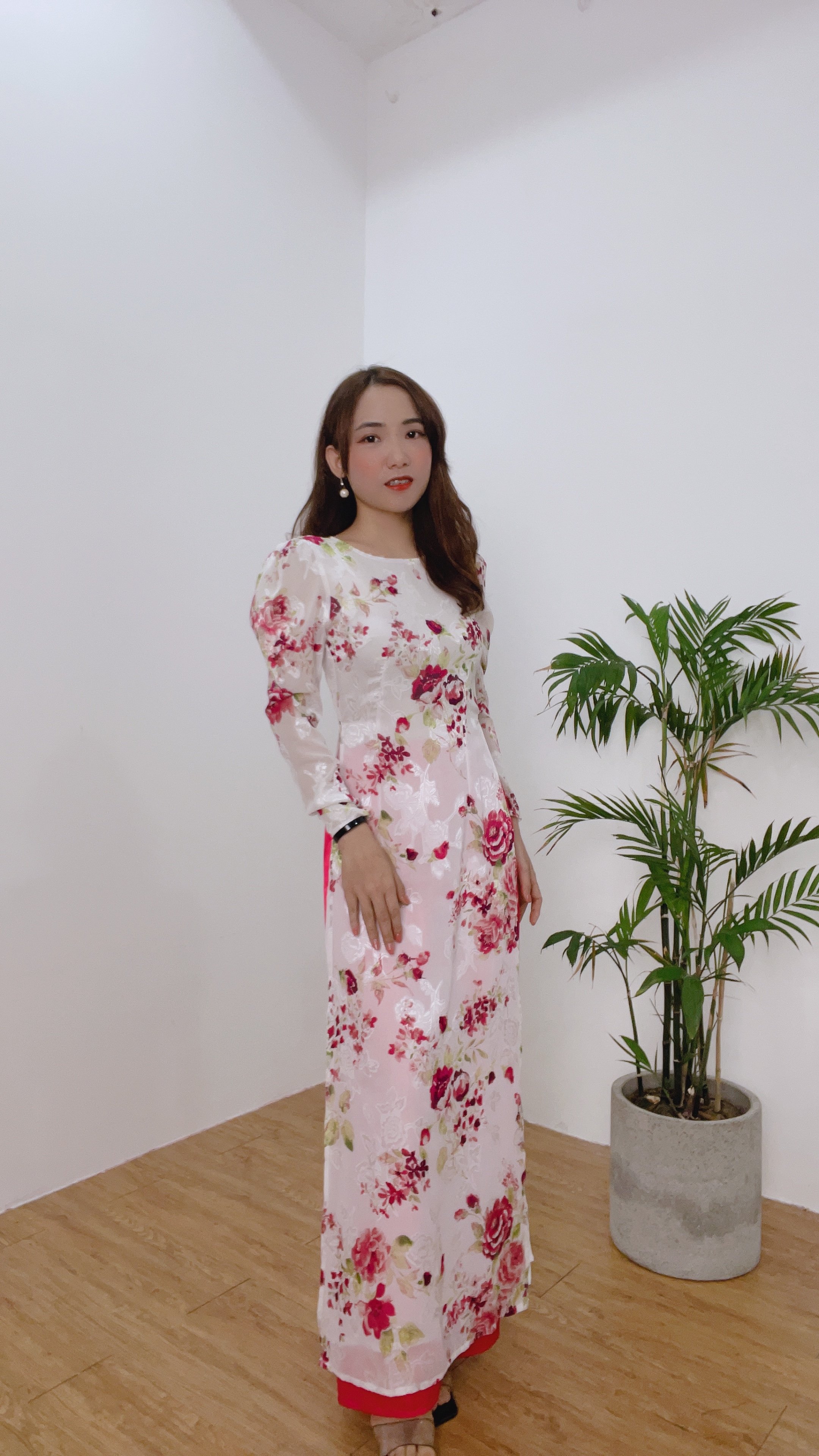 Áo dài may sẵn đẹp nữ thiết kế truyền thống cách tân tết hoa nhí nền hồng K151