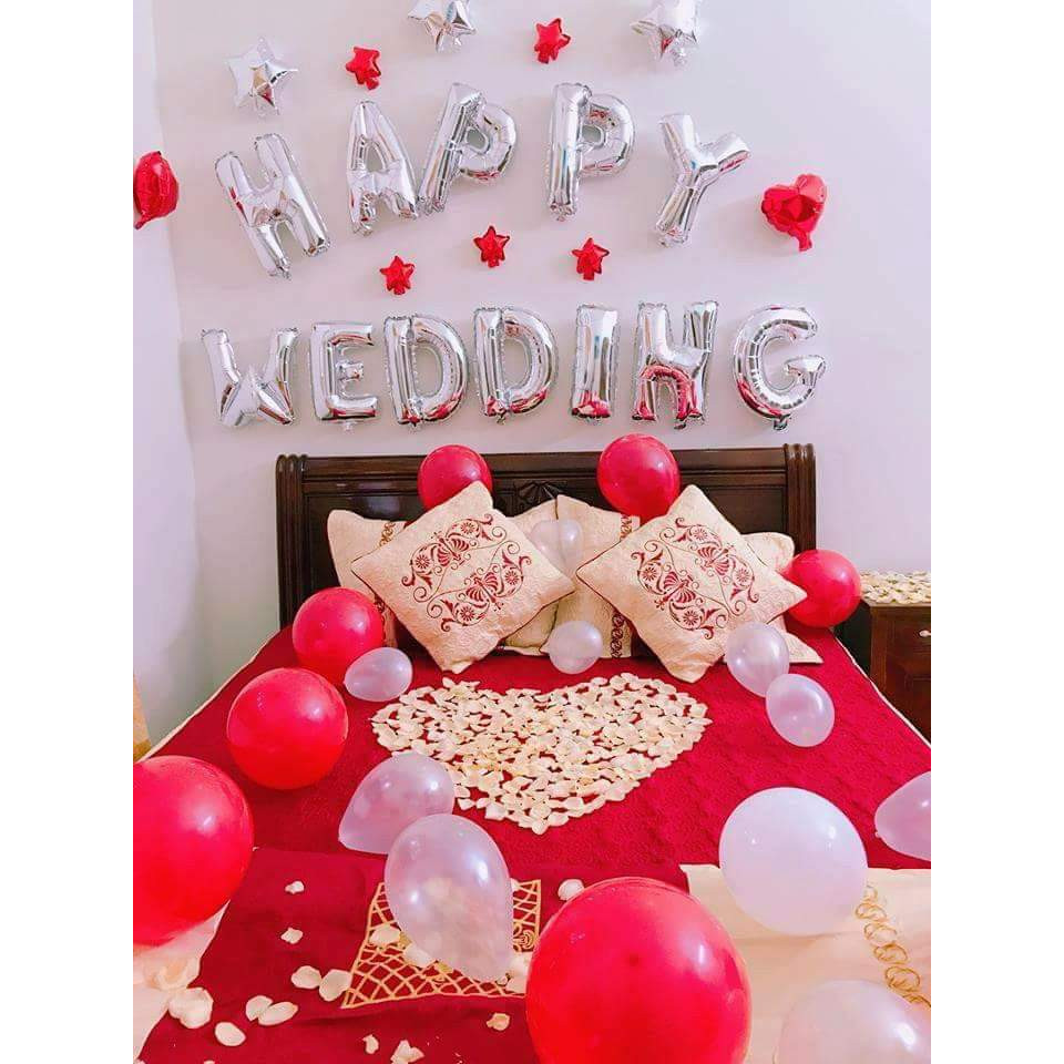 set gồm:Bộ chữ Happy wedding50 bóng trắng, đỏ3 bóng tim đại đỏ1 bóng tim đại bạcbơm taybăng dính bóng chuyên dụngdây ruy băng...