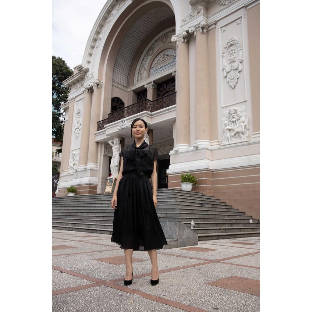 Sản phẩm sử dụng chất tơ mỏng nhẹ, có lót kín đáo. Chân váy dài ngang bắp chân, xếp li, đính kèm logo hoa hồng vàng đặc trưng của SHEAZ. Sản phẩm có thể mặc y mẫu, hoặc mặc phong cách cổ...