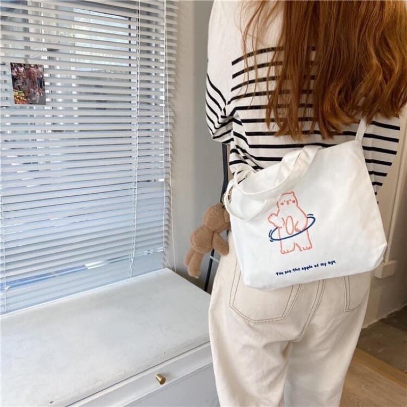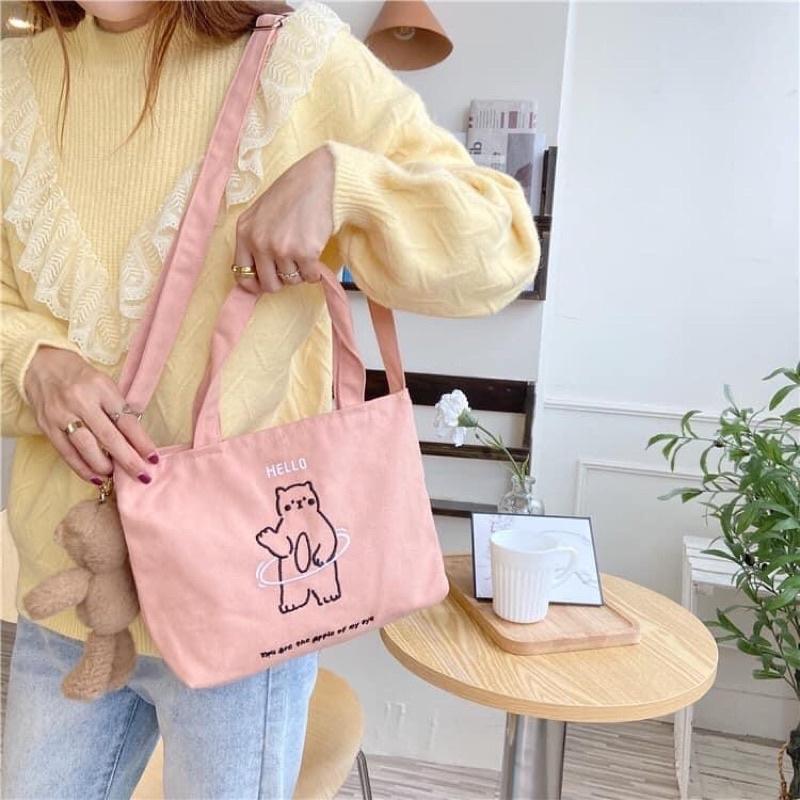 Túi Tote Túi Vải Canvas đeo chéo HelloGau thêu có dây kéo và ngăn phụ