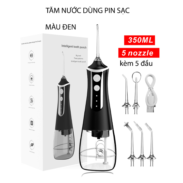 Tăm nước kèm 5 đầu xịt áp lực cao, dùng pin sạc 2000mAh Tăm nước dùng pin sạc được thiết kế đơn giản, tiện dụng chuyên dùng xịt làm sạch thức ăn bám răng. Có thể đi sâu vào những ngóc ngách bên trong mà tăm xỉa răng, bàn chải đánh răng không thể tiếp cận để lấy sạch cặn bã, giúp răng miệng luôn sạch sẽ, đặc biệt phù hợp các bạn niềng giăng Tăm nước trang bị pin sạc 2000mAh cho thời gian sử dụng lên tới 30 ngày mới phải sạc pin. Dung tích bình chứa 350ml, trong suốt dễ quan sát kèm theo 5 đầu phun xịt rất tiện dụng với 3 chế độ phun xịt tùy chỉnh Lợi ích của tăm nước: + Làm sạc mọi vị trí trong răng miệng + Không làm tổn thương răng lợi + Không làm chảy máu chân giăn + Sản phẩm cũng có thể dễ dàng hoàn thành việc làm sạch đa hướng các răng chỉnh nha, không còn làm bận tâm đến vấn đề chải răng (niềng răng) Thông số kỹ thuật Model: L10 Chất liệu: Nhựa ABS, PC Công suất: 5W Điện áp: cổng USB 5V Pin sạc: 2000mAh Thời gian sạc đầy: 4-5 Tiếng Chân sạc: Type C Chế độ phun: 3 chế độ (phun mạnh, phun vừa, chế độ xung) Thời gian sử dụng: khoảng 30 ngày Độ kín nước: IPx6 Áp suất nước: 30-110 PSI Dung tích bình chứa: 350ml Lưu ý nên dùng nước đã lọc qua RO để sản phẩm bền, không bị đóng cặn Bộ sản phẩm gồm: Thân máy, 5 đầu xịt, cáp sạcGiá sản phẩm trên Tiki đã bao gồm thuế theo luật hiện hành. Bên cạnh đó, tuỳ vào loại sản phẩm, hình thức và địa chỉ giao hàng mà có thể phát sinh thêm chi phí khác như phí vận chuyển, phụ phí hàng cồng kềnh, thuế nhập khẩu (đối với đơn hàng giao từ nước ngoài có giá trị trên 1 triệu đồng).....