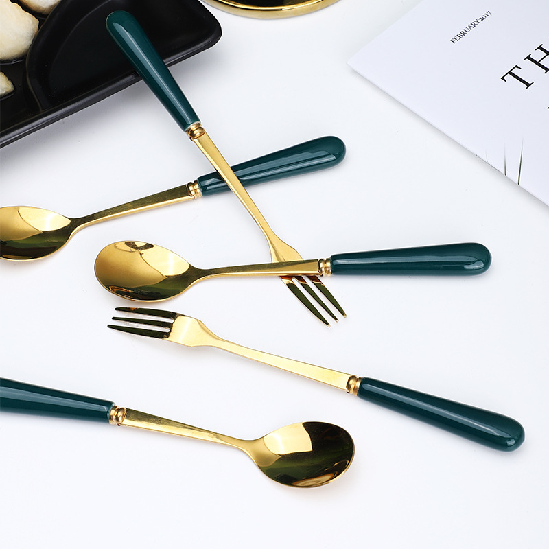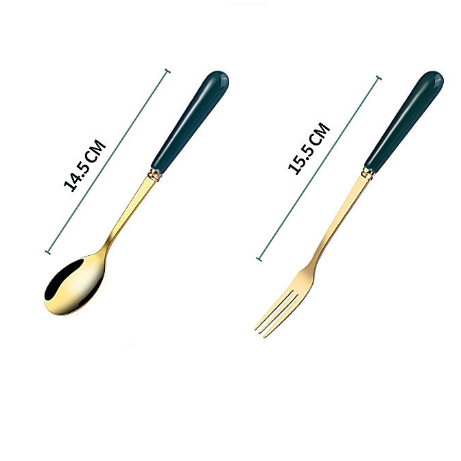 Thìa Dĩa Mạ Vàng Cán Sứ Xanh Nĩa Ân Trái Cây Uống Cà Phê KT:15cm