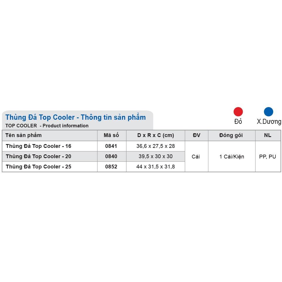 ông tin chung: Thùng đá giữ nhiệt • Chất liệu: nhựa PP, PU, HDPE. • Hiện bên mình có bán các loại dung tích như bên dưới. Nhưng do cân nặng, kích thước khác nhau nhiều nên mình post thành nhiều sản phẩm khác nhau. Quý khách vào đặt hàng có thể gõ tìm : “thùng đá vuông” (từ 12L đến 150L) , “bình đá” (từ 0.5L-27L). Thùng đựng đá vuông có các loại sau (phân loại theo kiểu dáng): Dài x Rộng x Cao LOẠI THÙNG ĐÁ VUÔNG TOP COOLER: – 16L: 36 x 27 x 28 cm (dung tích thùng bên trong: 11.5L) – 20L: 39 x 30 x 30 cm (dung tích thùng bên trong: 14.5L) – 25L: 44 x 31 x 31 cm (dung tích thùng bên trong: 19L) – 35L: 53 x 35 x 36 cm (dung tích thùng bên trong: 29L) – 45L: 55 x 38 x 38 cm (dung tích thùng bên trong: 38L) – 70L: 64 x 45 x 41 cm (dung tích thùng bên trong: 56L) 2. Xuất xứ: Việt Nam. Thương hiệu: Tý Liên 3. Đặc điểm: • Nhựa chính phẩm cứng cáp, bền đẹp • Màu sắc: đỏ, xanh dương. • Ứng dụng công nghệ của tủ lạnh, tủ cấp động. Thùng đá vuông có cấu tạo 3 lớp: lớp ngoài HDPE, lớp giữ PU giữ lạnh hiệu quả, lớp trong cùng là nhựa PP an toàn. Cho khả năng giữa lạnh lên đến 36h. 4. CHÍNH SÁCH BÁN HÀNG VÀ BẢO HÀNH – Cam kết hàng chính hãng – Được đổi trả nếu khách hàng không hài lòng về sản phẩm: hàng không giống hình, giao sai sản phẩm • Trường hợp đổi trả do lỗi của shop: phí vận chuyển do shop thanh toán • Trường hợp đổi trả không do lỗi của shop: phí vận chuyển shop không nhận thanh toán Giá sản phẩm trên Tiki đã bao gồm thuế theo luật hiện hành. Bên cạnh đó, tuỳ vào loại sản phẩm, hình thức và địa chỉ giao hàng mà có thể phát sinh thêm chi phí khác như phí vận chuyển, phụ phí hàng cồng kềnh, thuế nhập khẩu (đối với đơn hàng giao từ nước ngoài có giá trị trên 1 triệu đồng).....