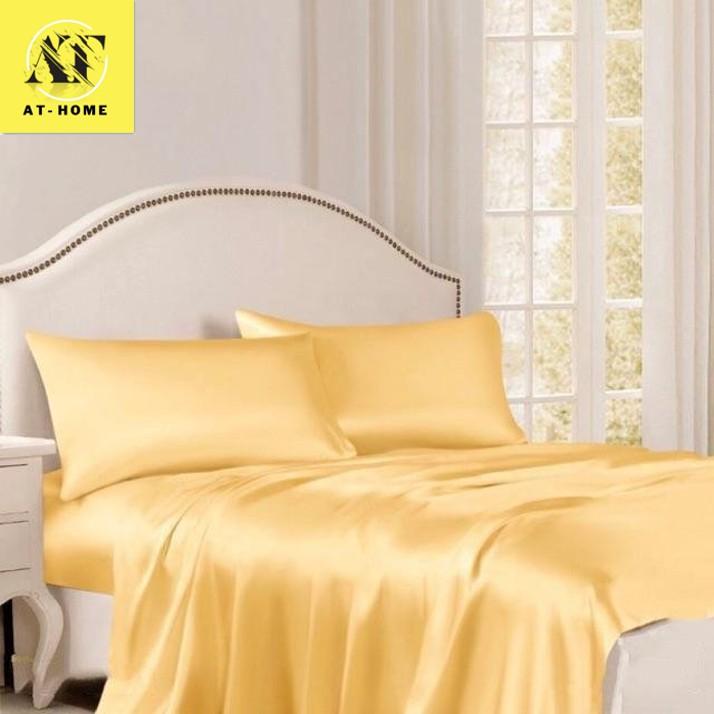 (Hàng LOẠI 1 - Không Nối Vải) Trọn Bộ Chăn Trần Bông Ga Gối Phi Lụa 5 Món Cao Cấp AT HOME - Màu Vàng Chanh - Ga lẻ 1m8x2mx20cm...