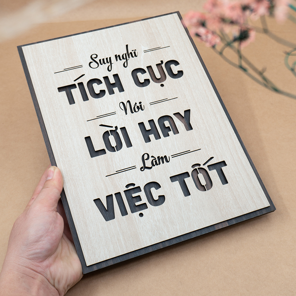 Tranh chữ slogan SAN-TR08 “Suy Nghĩ Tích Cực, Nói Lời Hay, Làm Việc Tốt” phù hợp cho bạn sử dụng trang trí văn phòng công ty. SANFACTORY chuyên cung cấp sản phẩm tranh chữ văn phòng với những câu Khẩu Hiệu, biểu ngữ có nội dung ngắn gọn, xúc tích nhiều ý nghĩa tích cực trong công việc, học học tập… THÔNG SỐ KỸ THUẬT TRANH SLOGAN: KÍCH THƯỚC 20x27cm | 30x40cm | 40x55cm ĐỘ DÀY 9mm CHẤT LIỆU Gỗ MDF chống ẩm phủ venner MÀU SẮC Vân gỗ 2 lớp màu tương phản LẮP ĐẶT Tranh treo có sẵn móc treo và đinh 3 chân, tranh để bàn có tặng kèm chân đế QUY CÁCH Cắt laser nội dung chìm 3D BẢO HÀNH 1 tháng PHỤ KIỆN Để bàn + Chân đế, treo tường + đinh và móc treo tường Tranh chữ slogan “Suy Nghĩ Tích Cực, Nói Lời Hay, Làm Việc Tốt” mang đầy ý nghĩa tích cực là một lựa chọn tuyệt vời để bạn treo tại văn phòng làm việc hoặc góc học tập của mình. Nếu tại đây bạn không chọn được cho mình mẫu mẫu slogan hay nào hãy liên hệ với SẦN nhé, SẦN sẽ tư vấn và lên thiết kế Demo cho bạn .Giá sản phẩm trên Tiki đã bao gồm thuế theo luật hiện hành. Bên cạnh đó, tuỳ vào loại sản phẩm, hình thức và địa chỉ giao hàng mà có thể phát sinh thêm chi phí khác như phí vận chuyển, phụ phí hàng cồng kềnh, thuế nhập khẩu (đối với đơn hàng giao từ nước ngoài có giá trị trên 1 triệu đồng).....