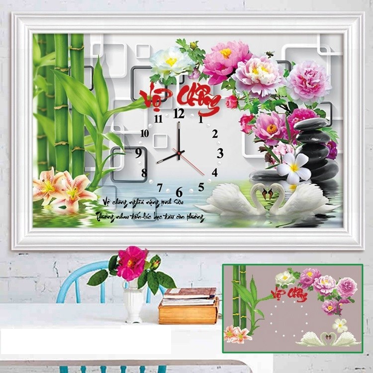 Tranh thêu chữ thập đồng hồ uyên ương LV3144 - 64 x 43 cm - chưa thêu