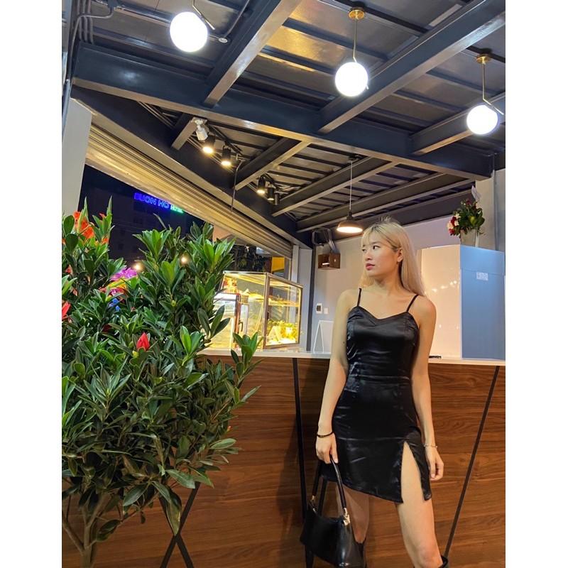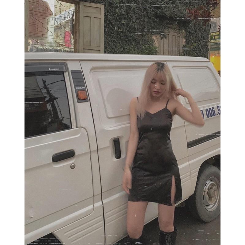 Váy lụa 2 dây - Váy lụa hai dây đen xẻ một bên đùi