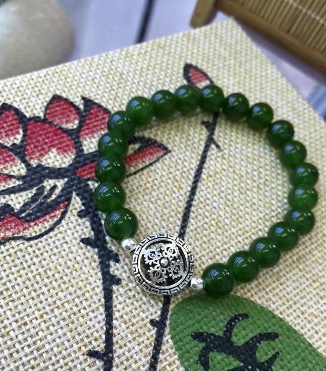 Vòng tay phong thủy đá Mã Não Xanh 8 ly mix Charm Bạc Bánh Xe Pháp Luân