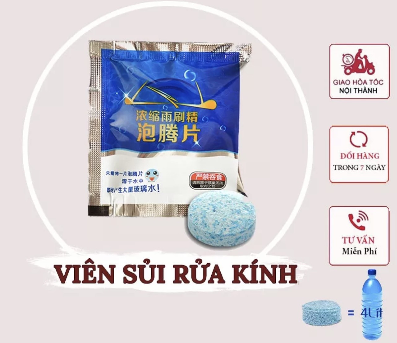 CÔNG DỤNG SẢN PHẨM VIÊN SỦI RỬA KÍNH️ Viên sủi rửa kính =>> 1 viên sủi + 3L nước sạch = dung dịch rửa kính đậm đặc ️ Nước rửa kính ô tô giúp kính sạch hơn, trong hơn, hạn chế trầy xước ️ Nước rửa kính o to giảm thiểu tình trạng đọng nước trên kính lái ️ Viên sủi rửa kính ô tô khắc phục tình trạng kẹt/rít khi sử dụng cần gạt nước, kéo dài tuổi thọ lưỡi gạt ️ Nước rửa kính xe ô tô không chứa cồn hoặc các chất bay hơi nhanh, không gây hại cho kính ️ Nước rửa kính xe hơi hoàn toàn không mùi, an toàn với da tay ️ Có thể pha sẵn dung dịch ra chai nhựa để dùng dần cho tiết kiệm hoặc bỏ trực tiếp viên sủi vào bình chứa nước rửa kính của xe (dưới nắp capo) rồi châm thêm nước cho đầy ️ Đóng gói riêng từng viên trong túi bạc nhỏ gọn, tiện dụng và dễ bảo quảnGiá sản phẩm trên Tiki đã bao gồm thuế theo luật hiện hành. Bên cạnh đó, tuỳ vào loại sản phẩm, hình thức và địa chỉ giao hàng mà có thể phát sinh thêm chi phí khác như phí vận chuyển, phụ phí hàng cồng kềnh, thuế nhập khẩu (đối với đơn hàng giao từ nước ngoài có giá trị trên 1 triệu đồng).....Sản phẩm này là tài sản cá nhân được bán bởi Nhà Bán Hàng Cá Nhân và không thuộc đối tượng phải chịu thuế GTGT. Do đó hoá đơn VAT không được cung cấp trong trường hợp này.