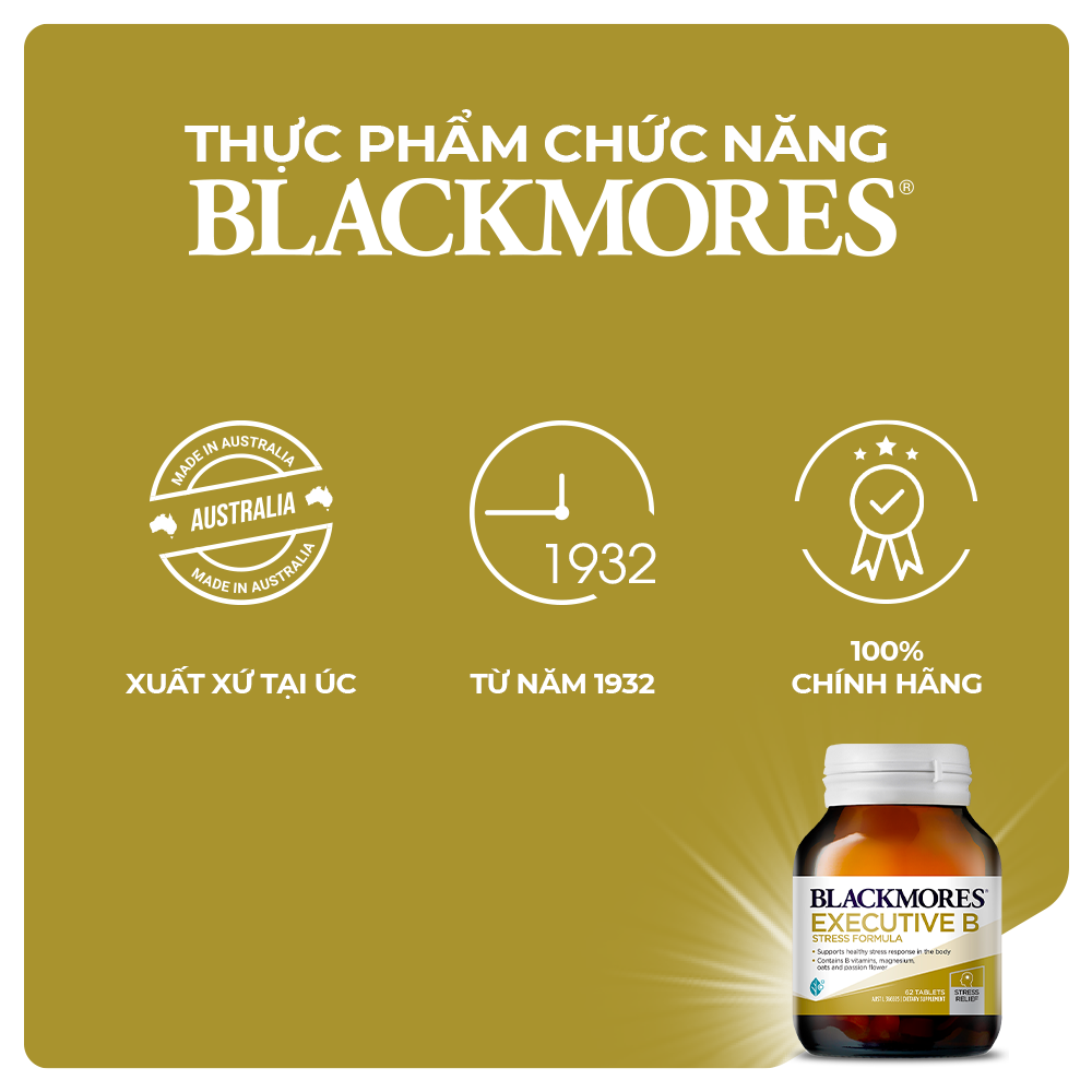 Cuộc sống hiện đại có vô vàn áp lực từ công việc, học tập hay gia đình khiến bạn cảm thấy mệt mỏi, căng thẳng. Viên uống hỗ trợ giảm stress Blackmores Executive B Stress Formula là sự kết hợp của các dưỡng chất, vitamin nhóm B và magie chiết xuất từ thảo mộc thiên nhiên giúp an thần, hỗ trợ giảm căng thẳng thần kinh, giúp bạn thoải mái hơn để nâng cao hiệu suất công việc. THÔNG TIN CHI TIẾT Thành phần: • Vitamin B1 (Thiamine hydrochloride): 75 mg • Vitamin B6 (Pyridoxine hydrochloride): 25 mg • Vitamin B2 (Riboflavin): 10 mg • Axit Ascorbic: 130 mg (Tổng Vitamin C: 250mg) • Nicotinamide: 100 mg • Canxi ascorbate: 145 mg • Vitamin E (d-alpha -Tocopheryl succinate acid 41,3 mg): 50 IU • Vitamin B5: 68 mg (Pantothenic acid từ Calcium pantothenate 75mg) • Magnesium phosphate: 140 mg (tương đương magnesium 28.9mg) • Canxi Phosphate:100 mg (tương đương với Calcium 38.8mg) • Potassium phosphate dibasic: 75 mg • Vitamin B12 (Cyanocobalamin): 30 mcg • Vitamin H (Biotin): 20 mcg • Axit folic: 150 mcg • Chiết xuất Avena sativa (Oats) tương đương với hạt khô: 250 mg • Passiflora incarnata (Đậu mọng) chiết xuất tương đương với hoa quả khô và hoa quả: 100 mg • Lecithin: 50 mg • Cholin bitartrate: 25 mg • Inositol: 25 mg Công dụng: • Giúp bổ sung vitamin nhóm B cho cơ thể, hỗ trợ hệ thần kinh khỏe mạnh. • Hỗ trợ giảm stress, lo âu, căng thẳng, mang lại tinh thần thoải mái, tỉnh táo để tiếp tục làm việc hiệu quả. • Hỗ trợ cải thiện tình trạng mất ngủ và gia tăng chất lượng giấc ngủ. • Ngăn chặn những vấn đề nguy hại cho não khi bạn đối diện với stress thường xuyên. Hướng dẫn sử dụng: • Người lớn: Uống 1 viên cùng bữa ăn sáng và 1 viên cùng bữa ăn trưa, hoặc theo chỉ định của bác sĩ. • Trẻ em dưới 18 tuổi: Chỉ được uống khi có chỉ định của bác sĩ. Lưu ý: • Luôn đọc kĩ nhãn hộp và làm theo hướng dẫn sử dụng. • Sản phẩm không dành cho trẻ em dưới 12 tuổi. • Viên uống giảm stress này có chứa gluten và các sản phẩm từ đậu nành. • Phụ nữ mang thai và cho con bú cần tham khảo ý kiến bác sĩ trước khi dùng. • Nếu bạn đang uống thuốc đặc biệt khác, không nên uống nếu không có sự cho phép của bác sĩ. • Nếu các triệu chứng không chuyển biến tốt hơn, hãy đến gặp bác sĩ để được tư vấn. Hướng dẫn bảo quản: • Nơi khô ráo, thoáng mát. • Tránh ánh nắng trực tiếp, nơi có nhiệt độ cao hoặc ẩm ướt. • Đậy nắp kín sau khi sử dụng. Quy cách đóng gói: Lọ 62 viên Xuất xứ: Úc Nơi sản xuất: Úc Ngày sản xuất: Xem trên bao bì sản phẩm Hạn sử dụng: 24 tháng kể từ ngày sản xuất THÔNG TIN THƯƠNG HIỆU Blackmores là công ty dẫn đầu trong lĩnh vực chăm sóc sức khoẻ từ thiên nhiên của Úc được thành lập vào năm 1930. Dựa trên tầm nhìn và niềm đam mê của ông Maurice Blackmore – người sáng lập thương hiệu – Blackmores luôn nỗ lực tạo ra những sản phẩm bảo vệ sức khỏe từ các loại thảo mộc tự nhiên. Không chỉ gây ấn tượng về bề dày lịch sử và sự phát triển ổn định của công ty, Blackmores còn nỗ lực tạo ra nhiều hơn giá trị cộng đồng như bảo vệ môi trường, hỗ trợ cho cộng đồng, thúc đẩy tư duy đầu tư để có một cơ thể khỏe mạnh. Đến nay, Blackmores vẫn không ngừng nghiên cứu, tìm tòi để phát triển các sản phẩm mới nhằm mang đến sự chăm sóc tốt hơn cho sức khỏe khách hàng. Giá sản phẩm trên Tiki đã bao gồm thuế theo luật hiện hành. Bên cạnh đó, tuỳ vào loại sản phẩm, hình thức và địa chỉ giao hàng mà có thể phát sinh thêm chi phí khác như phí vận chuyển, phụ phí hàng cồng kềnh, thuế nhập khẩu (đối với đơn hàng giao từ nước ngoài có giá trị trên 1 triệu đồng).....