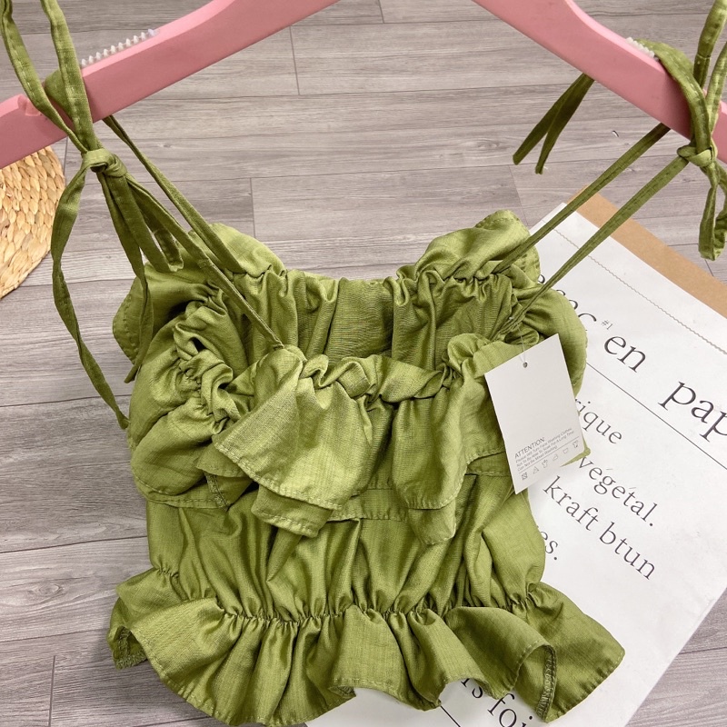 Áo 2 Dây Trễ Vai Chun Ngực Bèo Tầng Dáng Croptop Chất Đũi Màu Xanh Áo Hở Vai Cúp Ngực
