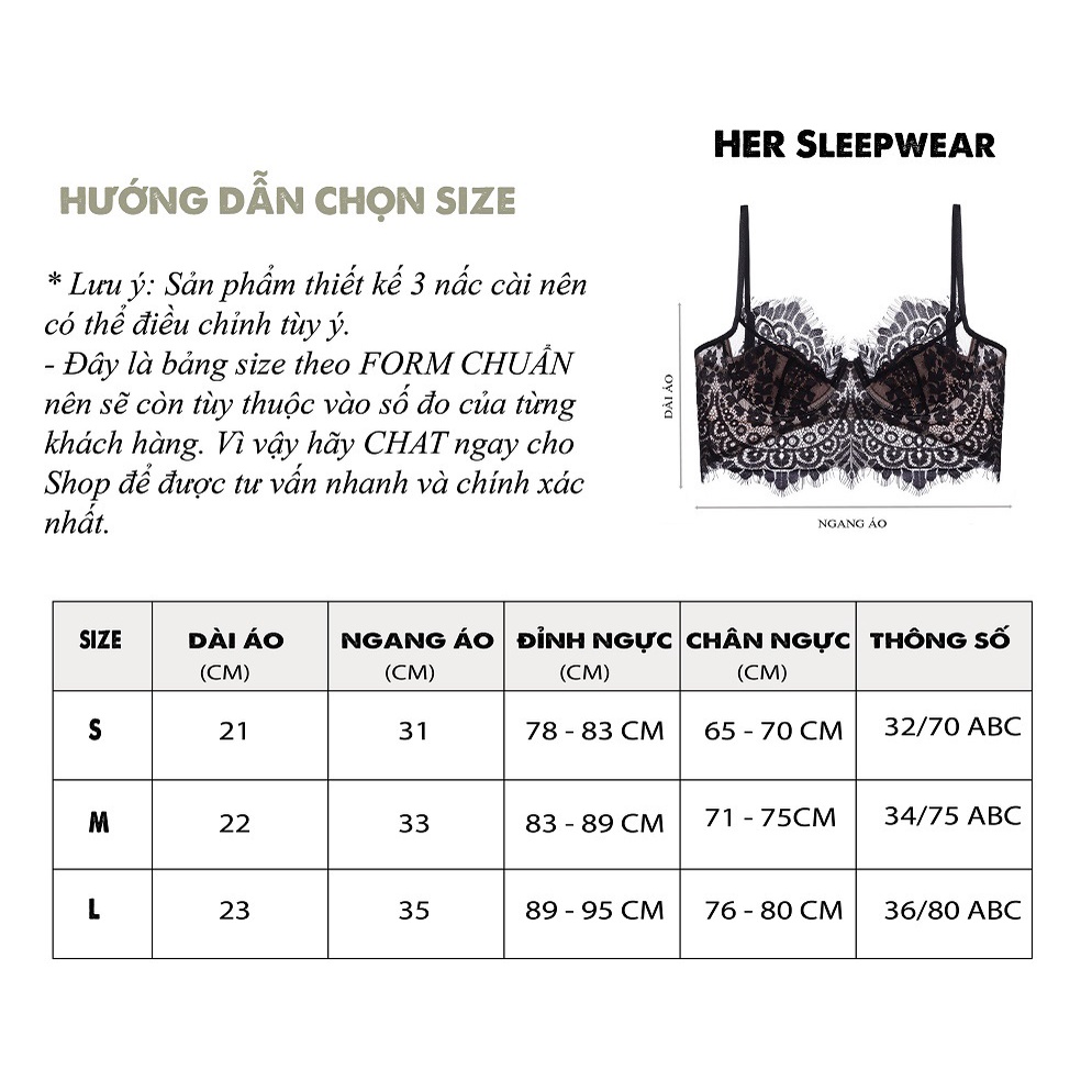 Áo bralette corset ren mềm mại bra ren có gọng mút mỏng xuyên thấu sexy BR09 Chi tiết sản phẩm: Chất liệu ren mềm cao cấp Kích thước áo bra : Size S - 32: 70 ABC - Vòng lưng: 65 - 70 cm. Vòng đỉnh ngực: 78 - 83 Size M - 34: 75 ABC - Vòng lưng: 71 - 75cm. Vòng đỉnh ngực: 83 - 89 Size L - 36: 80ABC - Vòng lưng: 76 - 80 cm. Vòng đỉnh ngực: 89 - 95 Màu sắc:đen, trắng Shop luôn che tên sản phẩm nhạy cảm và đồ lót được bảo quản tẩm ướp thơm trước khi đến tay khách hàng. Mô tả sản phẩm bralette ren: Dáng áo có gọng,mút mỏng, cúp khuôn mỏng tạo độ gợi cảm sexy Dây quai áo đàn hồi, co giãn mềm mại, không tạo vết hằn giúp chị em tự tin diện mọi trang phục Nhận hàng ưng ý cho Her 1 đánh giá 5* nhé Nàng ơi :* Hướng dẫn bảo quản áo bralette, áo ngực, đồ lót nữ: Sản phẩm đồ lót chỉ thích hợp giặt bằng tay, trong trường hợp giặt máy cần sử dụng túi giặt dành riêng cho đồ lót. Giặt sản phẩm áo corset không mút ở nhiệt độ thường, không quá 40°C. Không sử dụng chất tẩy, xà phòng có chứa chất tẩy trắng sẽ làm ảnh hưởng màu sắc của sản phẩm. Không giặt khô các sản phẩm áo lót, áo corset, đồ lót Không vắt khô bằng máy, có thể hỏng độ đàn hồi và hình dạng của sản phẩm. Không được ủi các sản phẩm áo corset ren Cam kết của Her sleepwear&lingerie Cam kết chất lượng tốt nhất, màu sắc, mẫu mã sản phẩm y như hình. Hàng tuyển chọn. Hỗ trợ đổi trả theo quy định của shopee: 1. Điều kiện áp dụng (trong vòng 07 ngày kể từ khi nhận sản phẩm) Hàng hoá vẫn còn mới, chưa qua sử dụng, còn nguyên tem mác, chưa giặt. Sản phẩm bị lỗi hoặc hư hỏng do vận chuyển hoặc do nhà sản xuất. 2. Trường hợp được chấp nhận: Hàng không đúng size, kiểu dáng như quý khách đặt hàng Không đủ số lượng, không đủ bộ như trong đơn hàng 3. Trường hợp không đủ điều kiện áp dụng chính sách: Quá 07 ngày kể từ khi Quý khách nhận hàng Gửi lại hàng không đúng mẫu mã, không phải sản phẩm của Her Không thích, không hợp, đặt nhầm mã, nhầm màu,... Do màn hình và điều kiện ánh sáng khác nhau, màu sắc thực tế của sản phẩm có thể chênh lệch khoảng 5-10% LƯU Ý Shop chỉ giải quyết khiếu nại nếu khách hàng có video quay lại khi nhận hàng, bóc hàng, kiện phải đủ tem mác gói bọc như ban đầu #ao #bralette #brallete #khong #mut #bo #do #lot #ren #mem #sexy #cogong #sieuxinh #dolotbo #dolotren #dolotxinh #dolotsexy #dolotre #bodolotren #bodolotsexy #bodolotnu #dolotcogong #dolotrenmem#aobraren #renxuyenthau #khongdem #aobrahangcuc #hanfcuc #quanlotlotkhe #quanlotkhe #quanrenlotkhe #thoitrangnu #noiynu #bra #aobranu #aobra