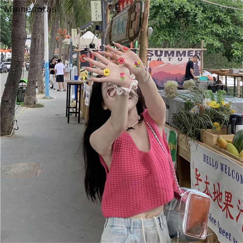Áo croptop Mùa hè ngọt ngào vòng cổ đan đầu phụ nữ rắn màu tay lỏng lẻo vest áo 2 dây