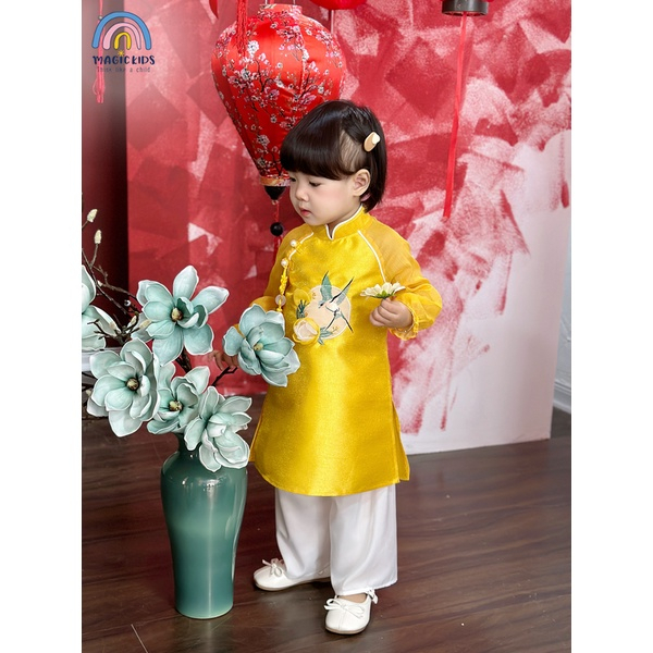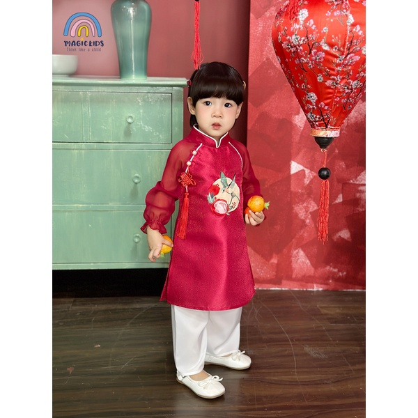 Áo dài cách tân cho bé gái 1 2 3 4 5 6 7 tuổi Annie Baby thêu hoa đào chim yến tay bồng phối ren cao cấp AD22013
