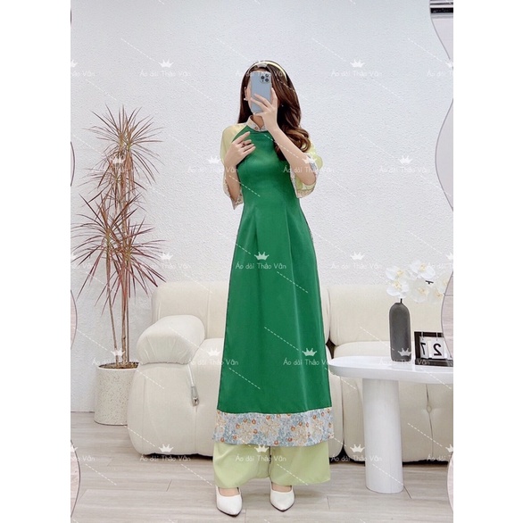 Áo dài cách tân thiết kế tay lỡ phối hoa nhí màu xanh lá cây-TV205