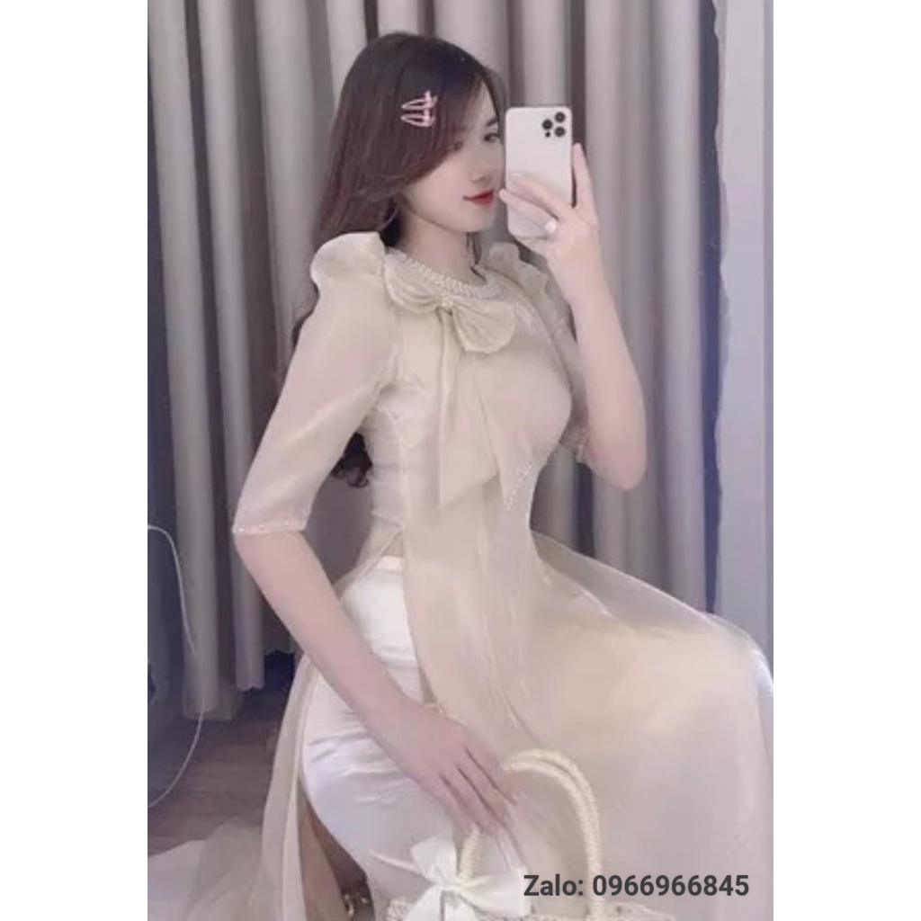 Áo dài màu da kết ngọc, đính nơ cách điệu tiểu thư - Áo Dài Đan Linh