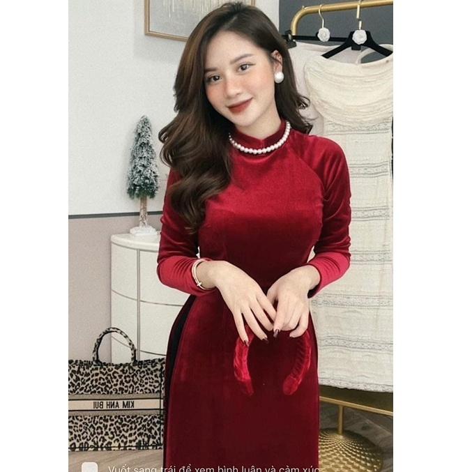 Áo Dài Nhung Đỏ Đô Mặc Tết Thời Trang May Sẵn Cao Cấp
