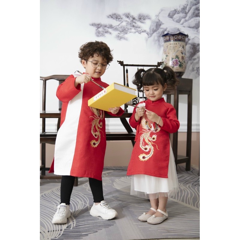 Áo dài tafta cao cấp thêu phượng bé trai bé gái 8-34kg