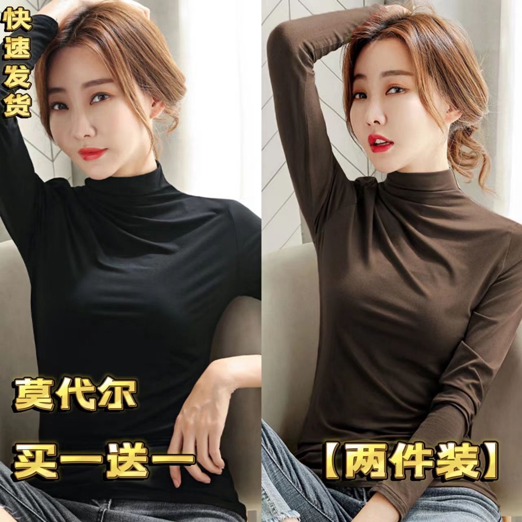 Áo giữ nhiệt nữ dài tay chất cotton co giãn lót nỉ cổ cao nhiều màu phong cách Hàn Quốc