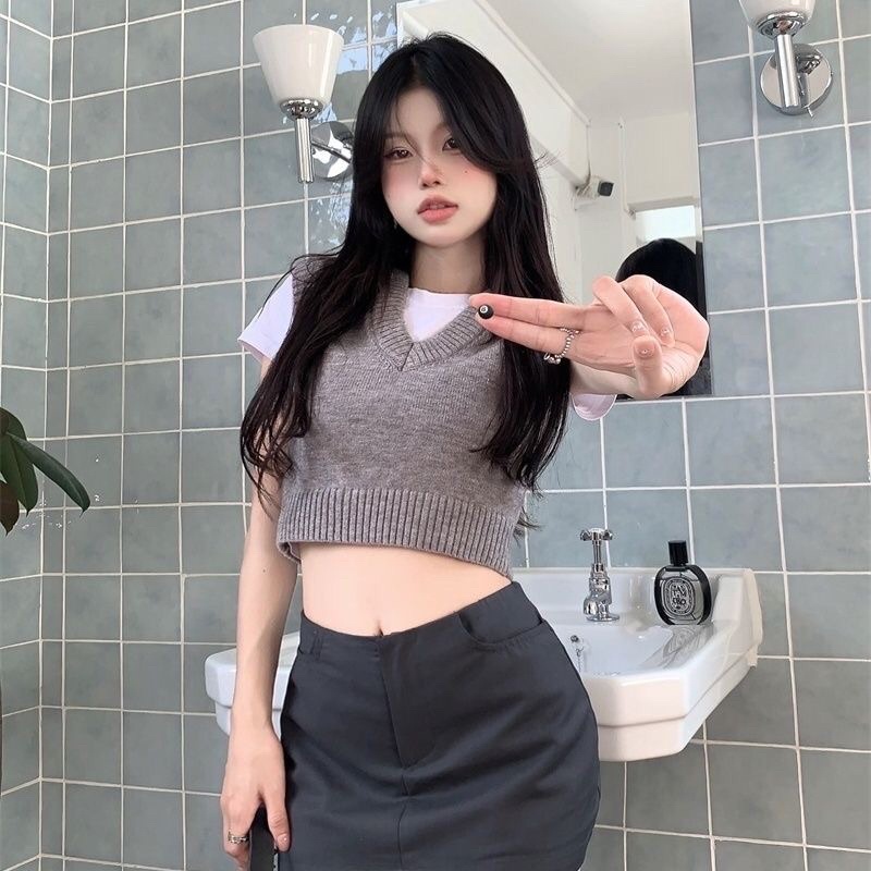 Áo gile xám croptop ngắn dáng ôm hot trend phong cách hàn quốc