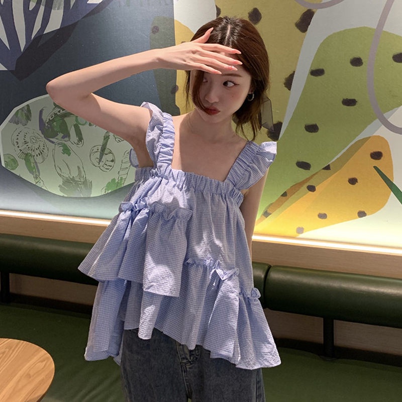 Áo Hai Dây Màu Trơn Họa Tiết Caro Thời Trang Mùa Hè 2022 Phong Cách Pháp Ngọt Ngào Dễ Phối Đồ Cho Nữ
