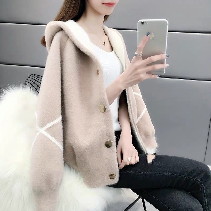 Áo Khoác Cardigan Dệt Kim Dáng Ngắn Giả Lông Cừu Có Mũ Trùm Mẫu Mới 2022 Thời Trang Mùa Xuân Cho Nữ