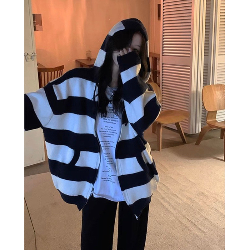 Áo khoác cardigan len dày dặn có mũ zip form rộng cá tính 🌷Thông tin sản phẩm • Áo chất liệu len đan, mềm mịn, không xù • Freesize < 60kg, áo dài 66cm, ngực 124cm, tay dài 54cm • Màu sắc: kẻ ngang xanh than và trắng 🌷 Hướng dẫn sử dụng: • Lần đầu tiên cả nhà giặt bằ