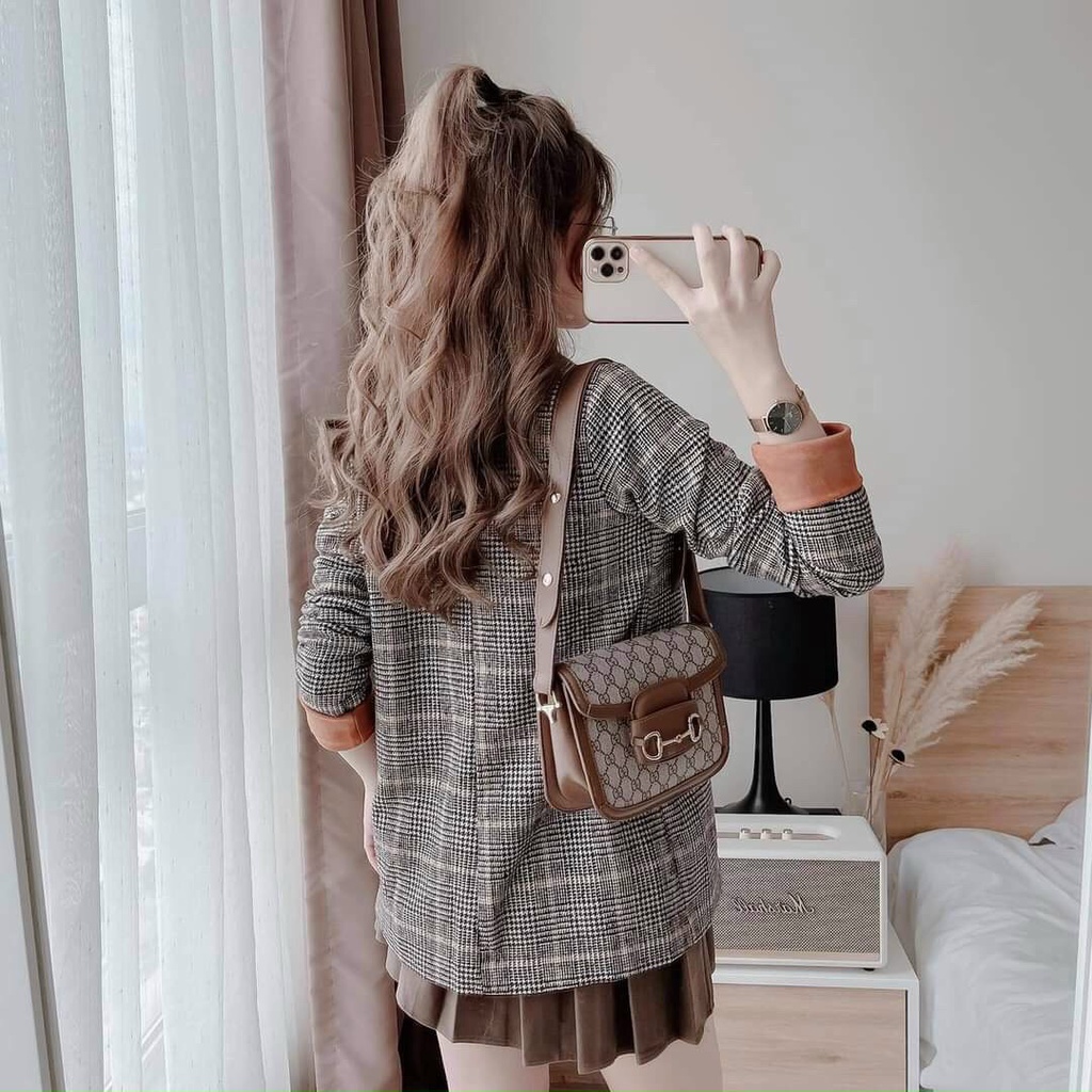 Áo khoác dạ nữ cao cấp, Áo khoác blazer dạ kẻ 2 lớp tay gập pha be