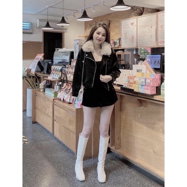 Áo khoác da nữ lót lông toàn thân cổ lông tháo rời được.hàng QC cao cấp