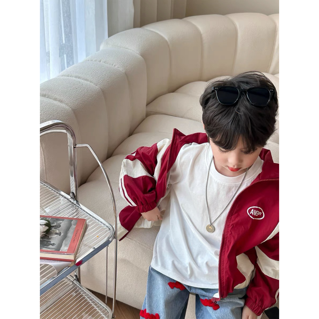 Áo khoác gió đỏ phối kẻ thu đông cho bé 6-26kg