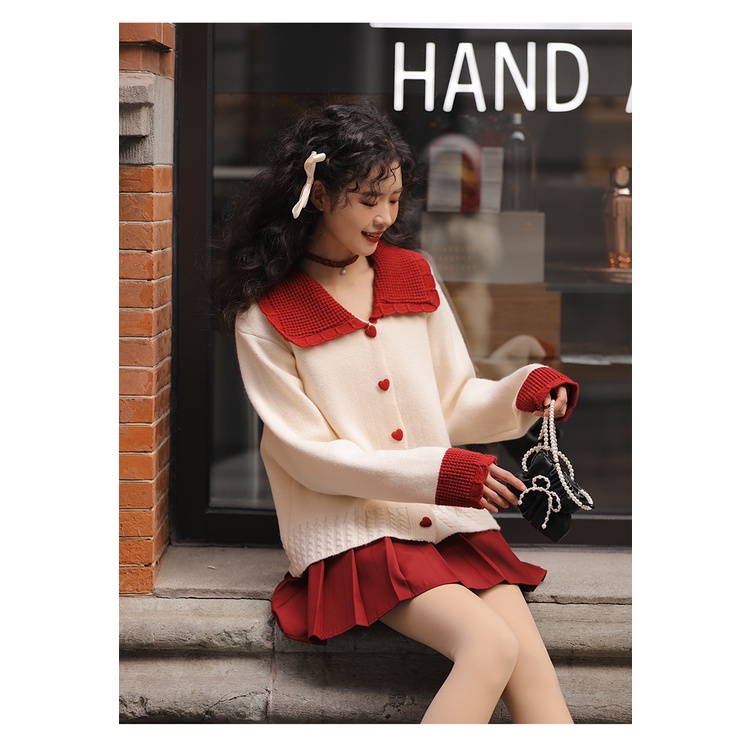 Áo khoác len cardigan nữ tay dài đỏ noel tết giáng sinh dáng ngắn dệt kim cổ bẻ cúc trái tim vintage Hàn Quốc E2-12.1