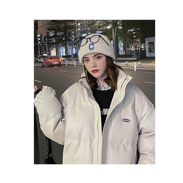 Áo khoác phao đệm dày da PU lông vũ phong cách phóng khoáng