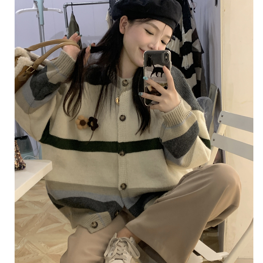 Áo len Áo Khoác cardigan Dệt Kim cho nữ Họa Tiết Kẻ Sọc Màu Tương Phản Phong Cách Hàn Quốc Cổ Điển AL02