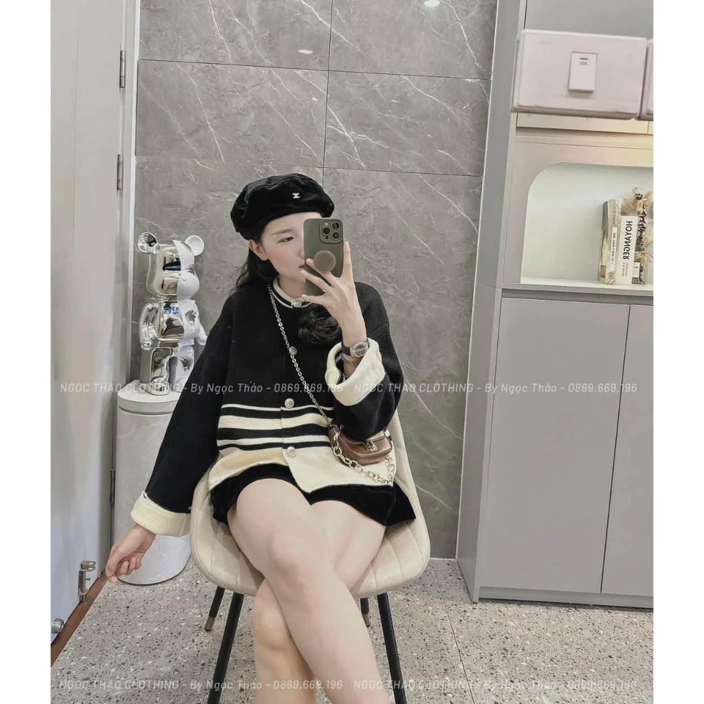Áo len cổ viền cài cúc pha 2 màu dài tay dáng rộng