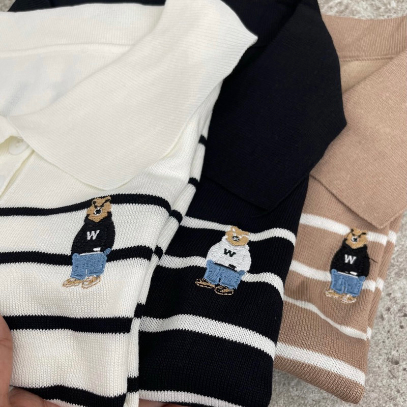 Áo len gấu polo cổ bẻ kẻ ngang, len mongtoghi cộc tay gấu thêu xinh 396
