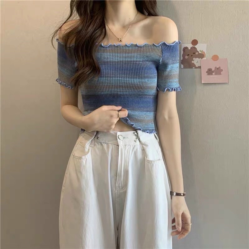 Áo len nữ cộc tay bẹt vai viền áo bèo xinh màu loang cầu vồng hot hit