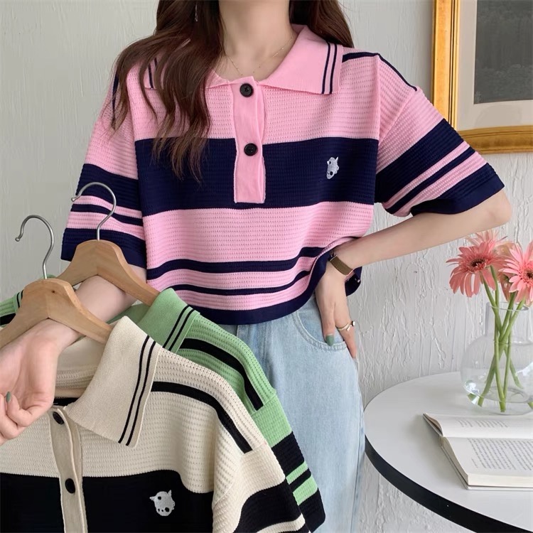 Áo len nữ Montoghi dệt kim Quảng Châu cổ bẻ cộc tay DÁNG RỘNG kẻ sọc RETRO có LOGO phong cách trẻ trung