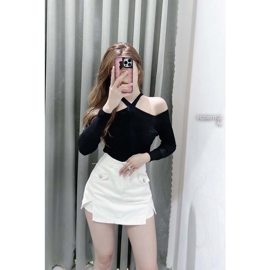 Áo len nữ phối gân tay dài cổ yếm khoét vai VIENS STORE