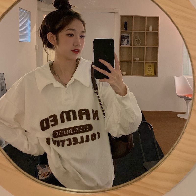 Áo Polo Sweater Nhung Tăm Thêu Chữ Form Rộng Phong Cách Âu Mỹ