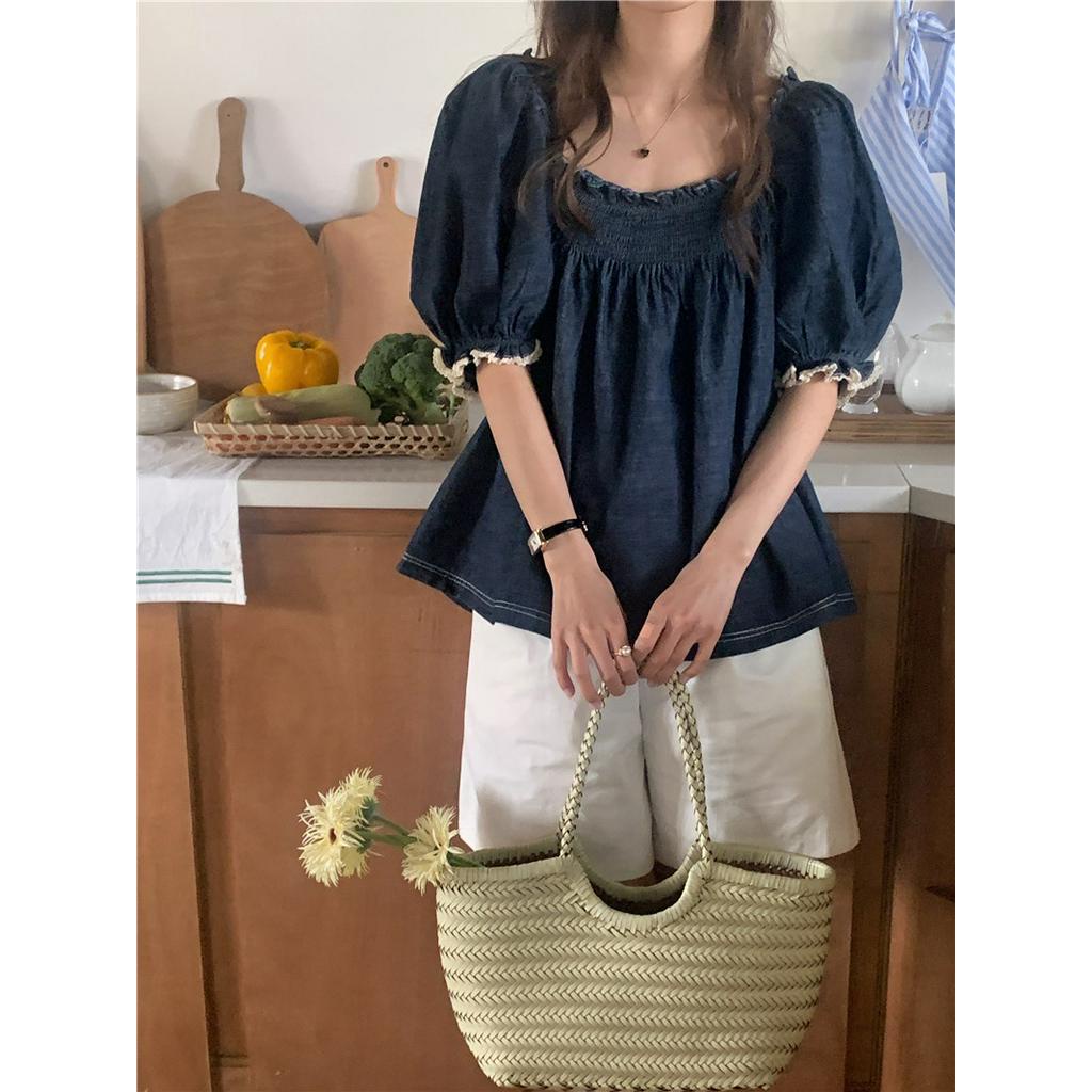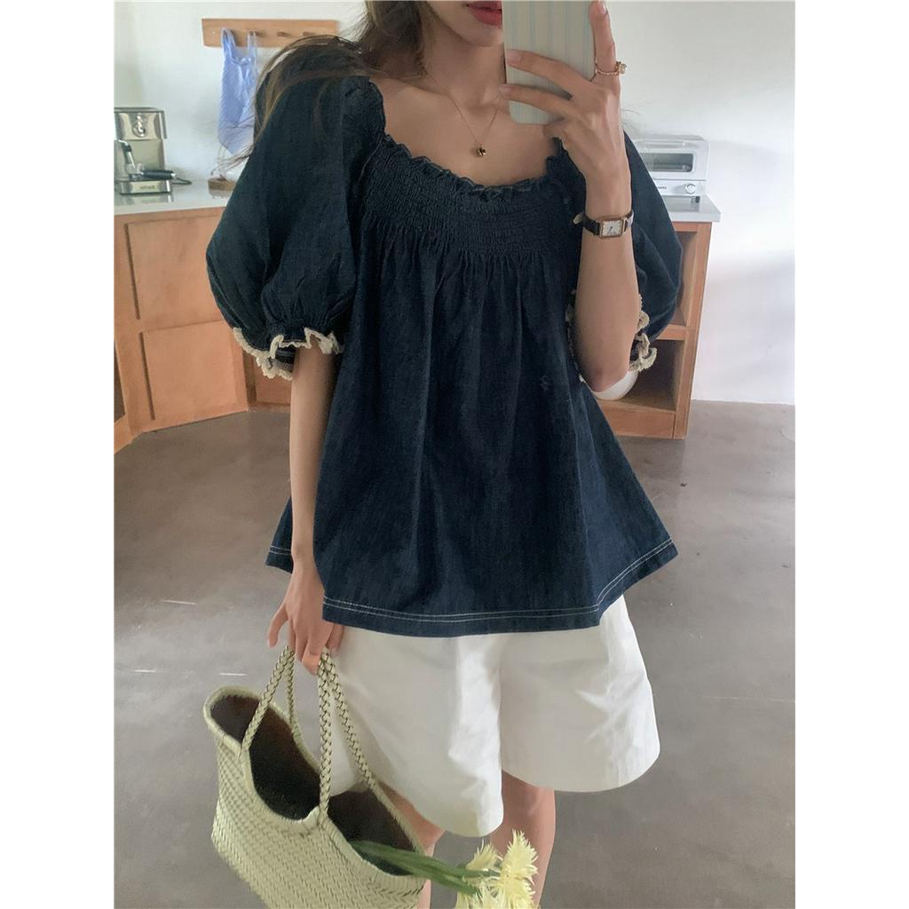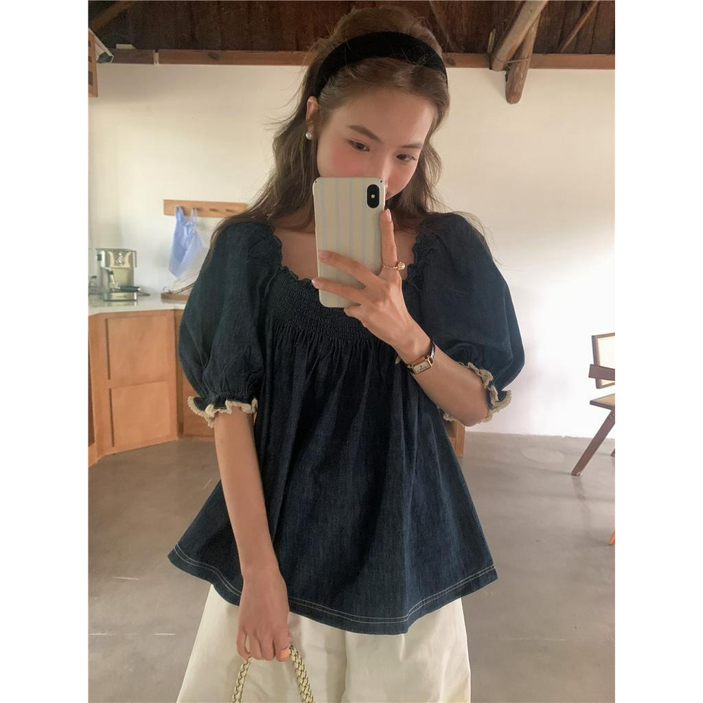 Áo Sơ Mi Vải Denim Dáng Rộng Ngắn Tay Phong Cách Ngọt Ngào Dễ Thương 63745