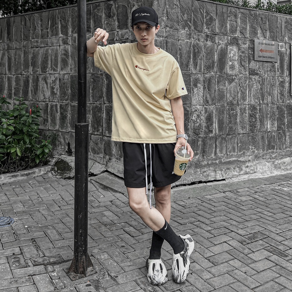 Áo Thun Champion Màu Tan Thêu Chữ Màu Nâu Ở Giữa Chất Liệu 100% Cotton Thoáng Mát Form Rộng Thoải Mái