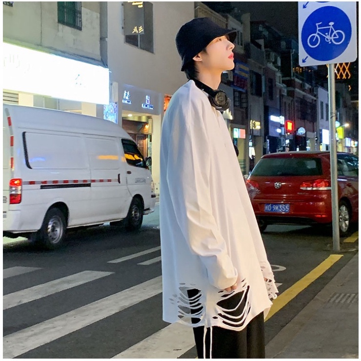 Áo thun dài tay 95% cotton rách gấu tạo layer màu basic hip hop unisex nam nữ