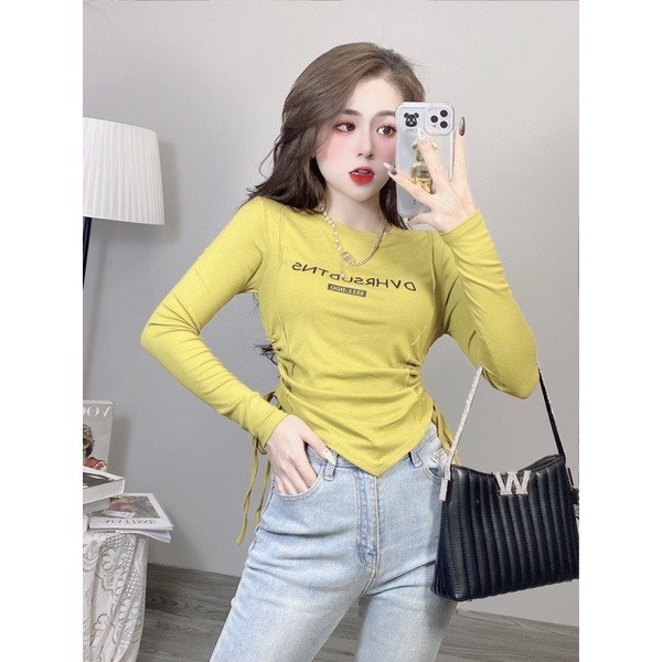 Áo Thun From Dài Cổ Tròn Dài Tay Kèm In Chữ Trước Ngực Phối Rút Dây Hai Bên TTSLA1027