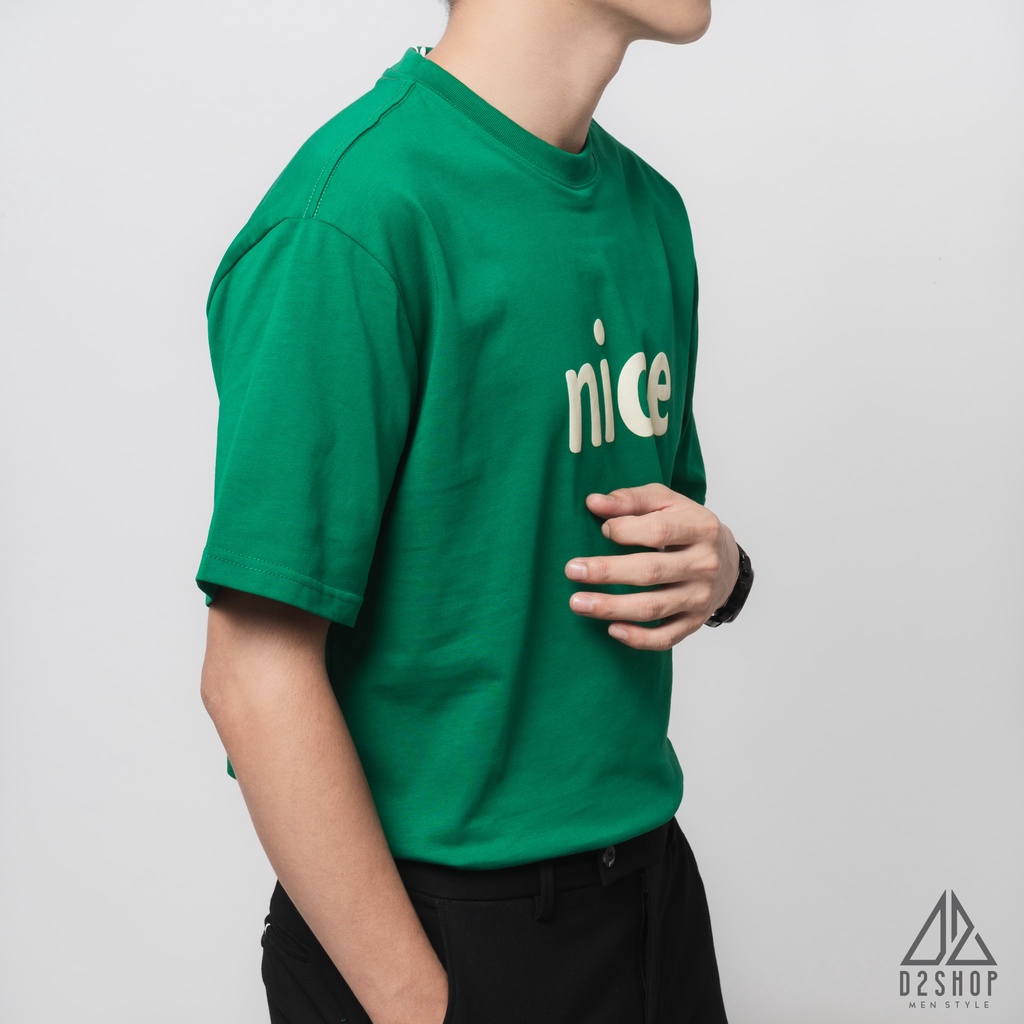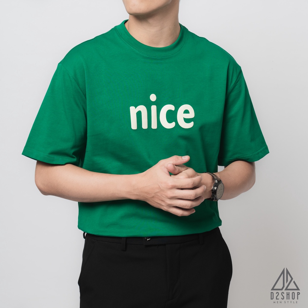Áo thun nam D2shop, áo thun cổ tròn in ngực NICE, màu xanh lá