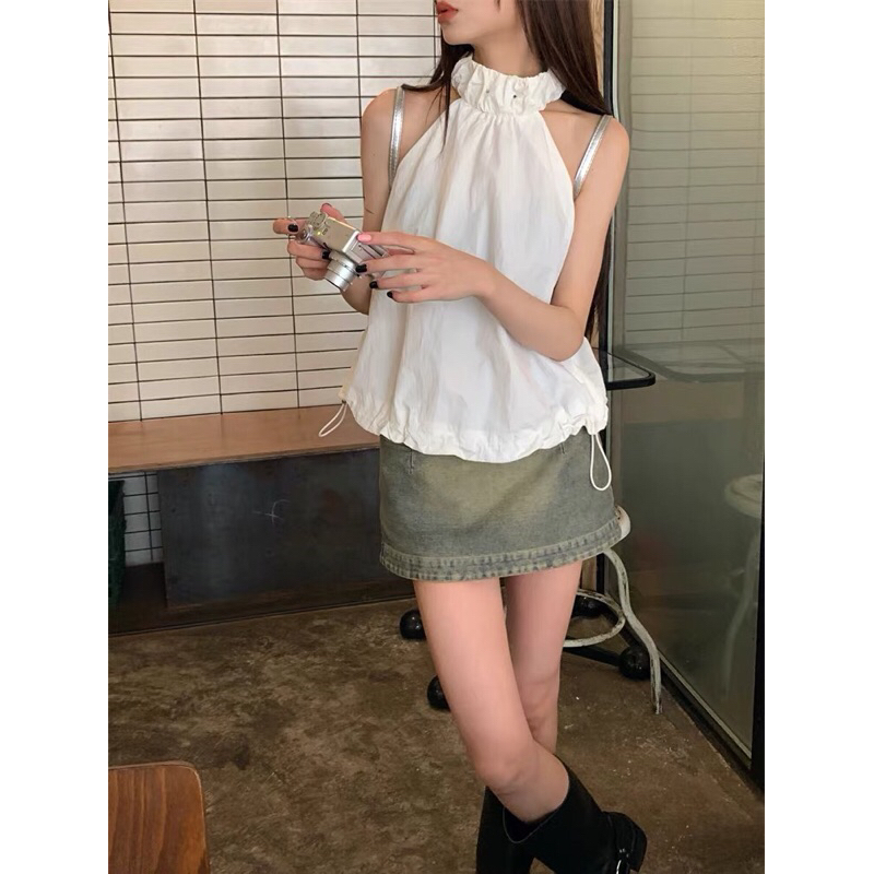 Áo Yếm Cổ Lọ Trắng Đính Cúc Kim Loại Phối Dây Rút Dáng Sát Nách Chất Vải Mềm Mịn beenchan