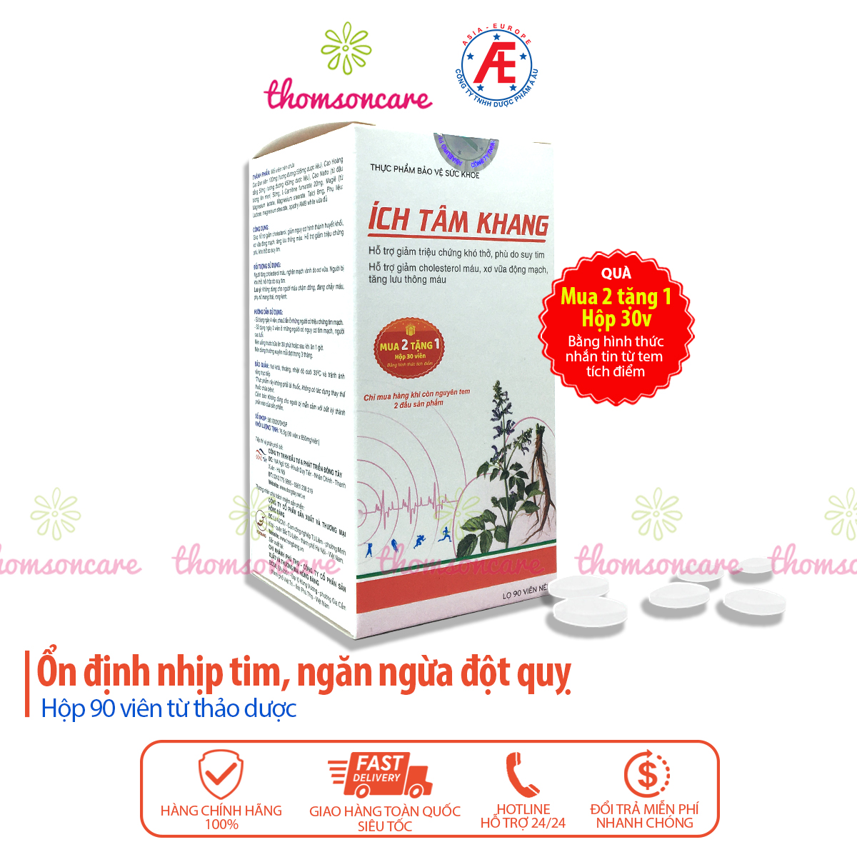 Ích Tâm Khang - Mẫu mới dạng lọ 90 viên - Hoặc hộp to 180v, Tặng thêm 1h Vỉ Tiết kiệm 335k Với phương châm “Vì sự hài lòng của Quý khách” - Thomsoncare luôn đồng hành cùng bạn "Chăm sóc sức khỏe ch...